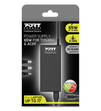 The Port Connect 65W Acer® and Toshiba® Notebook Adapter is a high quality replacement AC power supply for Acer® and Toshiba® laptops that require up to 65W of power. It comes with three different tips, making this widely compatible with multiple models. This adapter automatically adapts to the power requirements of your machine and thus protects against any risk of excess voltage damaging your device.