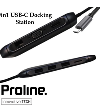 The Proline 9 in 1 USB-C Docking Station is a great choice for anyone who needs to connect multiple devices to their Computer. It features a single USB-C port that can be used to connect up to nine devices, including an HDMI monitor, VGA monitor, RJ45 Ethernet port, SD card reader, USB-C power delivery port, and three USB 3.0 ports. This dock also supports up to 4K resolution for a high-quality display. It is also compatible with both Mac and Windows operating systems, making it a great choice for users of all kinds. Its small size makes it easy to carry around, and its plug-and-play design means no drivers or software installation is necessary.