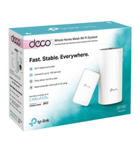 TP-Link DECO E3(2-PACK). Housing colour: White, Antenna type: External, LED indicators: Power,Status. Wi-Fi band: Dual-band (2.4 GHz / 5 GHz), Top Wi-Fi standard: Wi-Fi 5 (802.11ac), Wi-Fi standards: 802.11a,802.11b,802.11g,Wi-Fi 4 (802.11n),Wi-Fi 5 (802.11ac). Firewall security: SPI Firewall, Mobile operating systems supported: Android 4.4,Android 5.0,Android 5.1,Android 6.0,Android 7.0,Android 7.1,Android 7.1.2,Android.... AC adapter input voltage: 100 - 240 V, AC adapter frequency: 50/60 Hz, AC adapter input current: 0.3 A