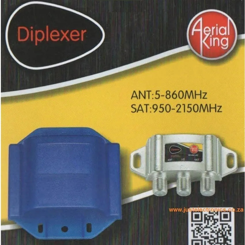 The Aerial King satellite/TV antenna diplexer combines signals from your satellite dish and VHF/UHF TV antenna into one coaxial cable output. Use a second diplexer to split the signals for connection to satellite or TV antenna jacks on your receiver.